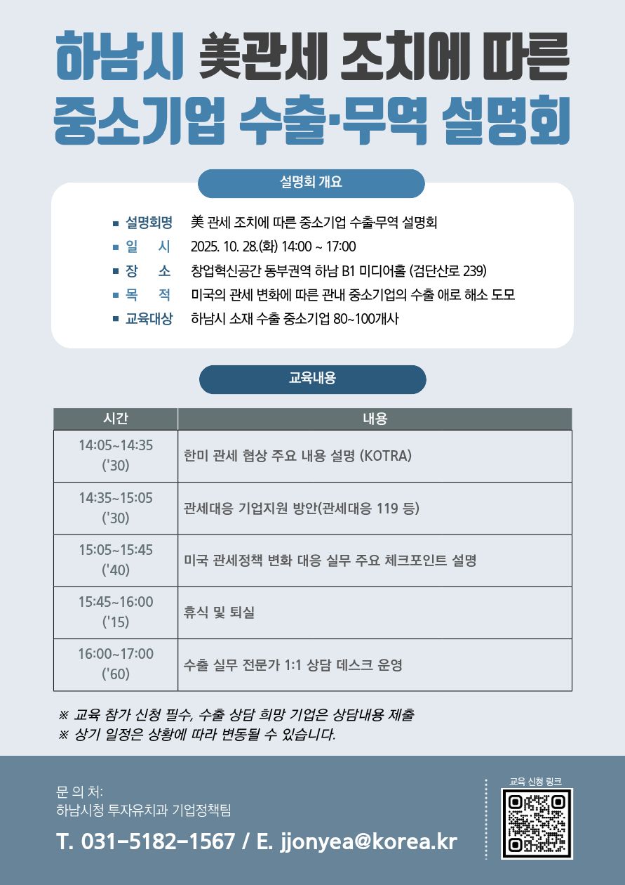 <설명회 개요> 1. 일 시: 2025. 10. 28.(화) 14:00 ~ 17:00 2. 장 소: 하남 벤처센터 B1미디어홀(검단산로 239) 3. 대 상: 하남시 소재 수출 중소기업 80~100개사 4. 내 용 가. 한-미 관세협상 주요 내용 및 관세 실무 주요 체크포인트 설명 나. 관세 대응 기업지원방안 설명 다. 수출 실무 전문가 1:1 상담데스크 운영(선착순 12개사에 한함) 5. 신청기간: 2025. 10. 13.(월) ~ 10. 22.(수) 18:00 -링크: https://naver.me/xTsDGh6q ※ 문의처: 하남시청 투자유치과 기업정책팀(☎031-5182-1567) |